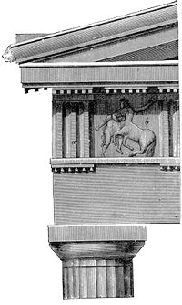 Sobre el entablamento se alza el frontón, plano triangular que cubre el hueco que deja la cubierta a dos aguas del edificio. Puede estar adornado por figuras de animales o vegetales llamados acroteras.