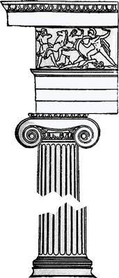 Columnas más altas y delgadas que las dóricas. Fuste que se levanta sobre una basa formada por dos molduras convexas, toro, separadas por otra cóncava, escocia.