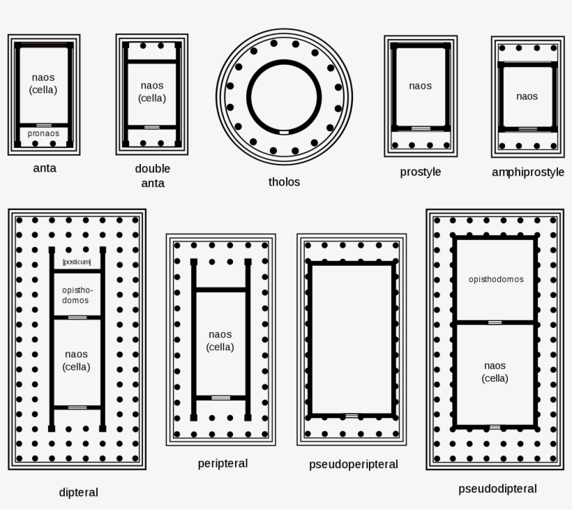 Planta, generalmente, rectangular, orientada al este y formada por la naos o cella, sala que guarda la estatua, alargada. Sus muros se prolongan a veces sobrepasando la puerta, y forman la anta. Delante de la naos está el pronaos, un pórtico que da acceso a la sala. Detrás, el opistodomos, un falso pórtico con columnas que no tiene acceso a la naos.