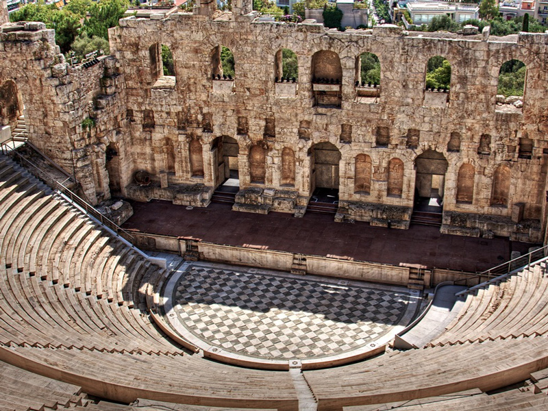 Se construyen desde época muy antigua, aunque se perdieron la mayoría de ellos. Disponen, generalmente sus gradas para el auditorio en la vertiente de una colina próxima a los centros urbanos. Esa gradería rodeaba casi toda la zona circular central llamado Orchestra, donde los coros cantaban y danzaban acompañando con la voz y el gesto la acción dramática. Las primeras filas estaban destinadas a los personajes más importantes y eran mucho más ricas. Solían llevar decoración e inscripciones.