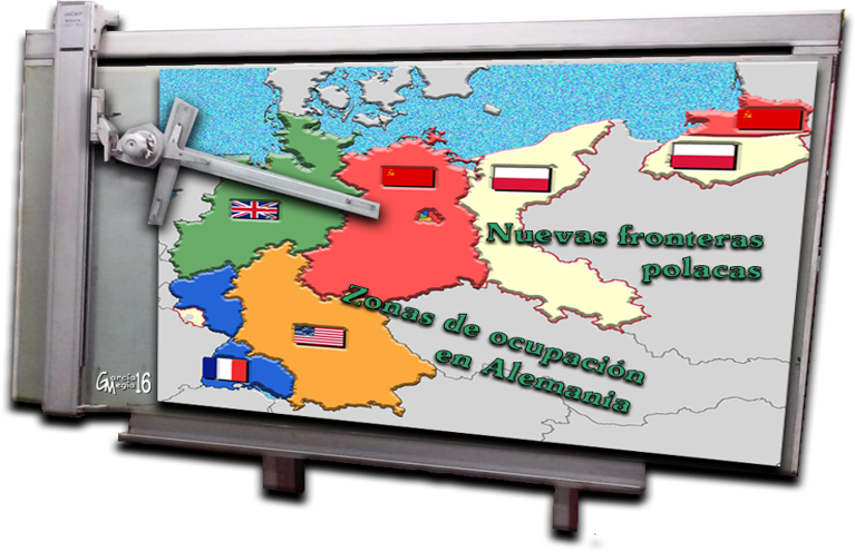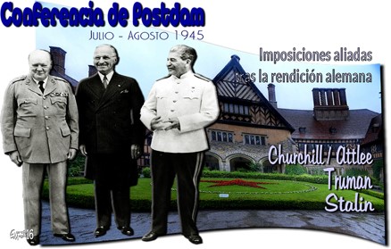 A partir de julio de ese mismo año, finalizada la contienda, Stalin, Truman y Attlee, en un ambiente de máxima desconfianza, confirman en Potsdam el futuro de Alemania. Establecen: