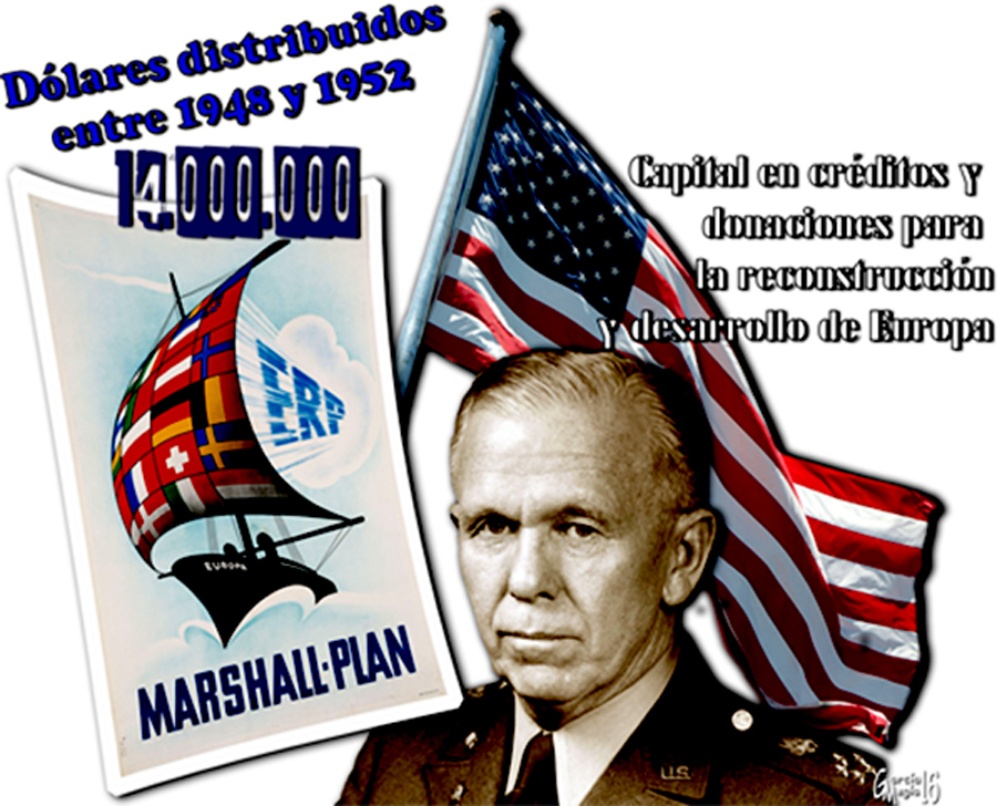 Inspirándose en la Doctrina Truman que propugna facilitar ayuda económica y militar a cualquier país en riesgo de caer en la órbita de influencia soviética, el Secretario de Estado americano George C. Marshall, elabora y propone en París el Programa de Reconstrucción Europea (ERP), más conocido como Plan Marshall, mediante el cual Estados Unidos se compromete a facilitar materias primas, productos elaborados y capital necesarios para la reconstrucción y desarrollo, en forma de créditos o donaciones.