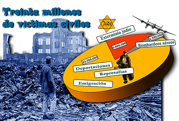 El mayor drama lo constituye el hecho de que más del 50 % contabilizado se refiere a población civil. Bombardeos aéreos, represalias, hambre, enfermedad, deportaciones, genocidio de colectivos concretos (judíos, gitanos…), son causa directa del hecho.