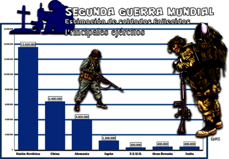 Los resultados referidos a víctimas estrictamente militares arroja resultados altamente dispares que oscilan entre los casi catorce millones de soldados soviéticos y los trescientos mil estadounidenses.