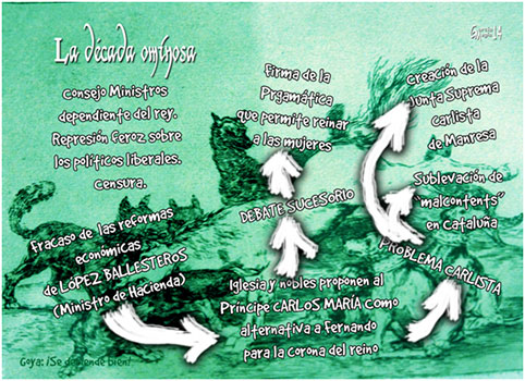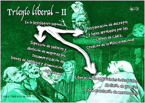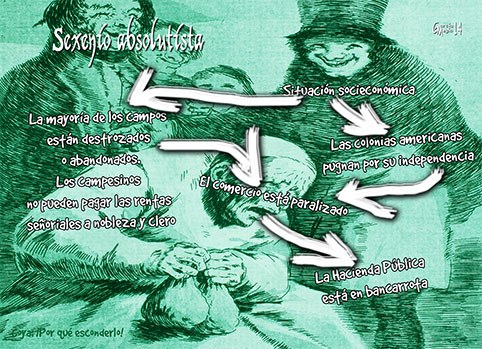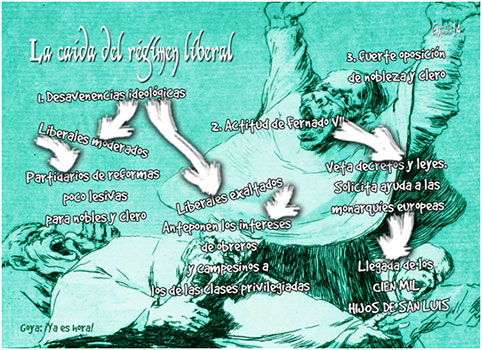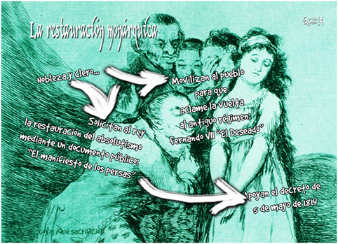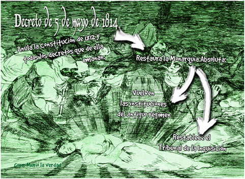 El golpe de estado absolutista ha triunfado. Se restaura la inquisición, regresan los jesuitas y se cierran universidades y periódicos.