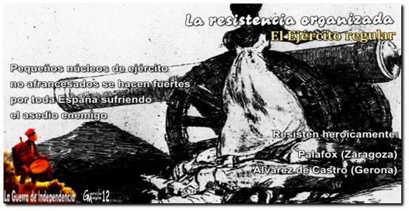 Por otro lado, restos del ejército regular se encierran en algunas ciudades y reparten armas entre sus habitantes que sufren el sitio francés. Gerona, defendida por Álvarez de Castro, y Zaragoza, bajo dirección de Palafox, aunque es Agustina de Aragón la que alcanza la condición de mito gracias a su heroica actuación.