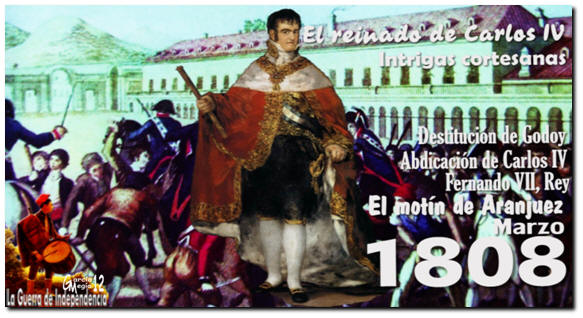 El partido fernandista conspira contra Godoy y el rey, pero sus planes para situar en el Trono al Fernando son descubiertos y éste detenido en El Escorial. Los cabecillas del intento de golpe de estado son identificados cobardemente por el príncipe y desterrados. Él implora por carta clemencia y es perdonado. En enero de 1808 nuevas tropas francesas al mando de Joaquín Murat atraviesan la frontera y se apodera con facilidad de San Sebastián, Pamplona y Barcelona, poniendo, a continuación, rumbo a Madrid. La acción sorprende en la corte. La familia real proyecta su traslado a Sevilla con la intención de huir a América llegado el caso. Los preparativos del viaje alarman al pueblo. Carlos IV, para tranquilizar la situación, publica una proclama negando el hecho. Los españoles piensan que Godoy ha vendido España. A partir del 17 de marzo el pueblo español se agita convulso. Una masa humana se agolpa frente al Palacio Real de Aranjuez y asalta la residencia del ministro que salva su vida huyendo escondido en un rollo de alfombras.