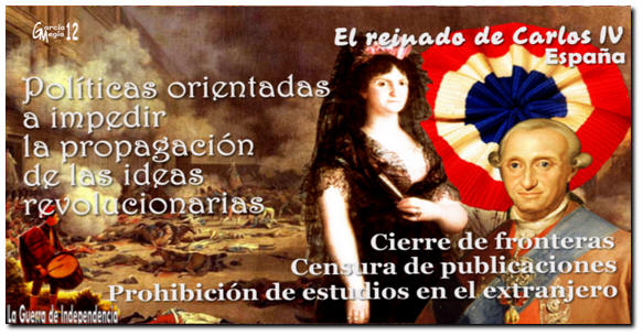 El reinado de este monarca está, además, fuertemente vinculado a los hechos y políticas vividas por la vecina Francia. Los acontecimientos de la primavera de 1789, la toma de la Bastilla y las actitudes revolucionarias del pueblo parisino, aconsejan al ministro español tomar medidas para evitar la propagación por España de ideas subversivas que defienden la soberanía popular y los derechos del hombre y del ciudadano. Se cierran fronteras, se prohíben publicaciones y se impide a los jóvenes estudiar en el extranjero. En enero de 1792, ante presiones diplomáticas francesas, Floridablanca es sustituido en su cargo por Aranda, muy pronto reemplazado, a su vez, por Godoy, Guardia de Corps y favorito de la reina.