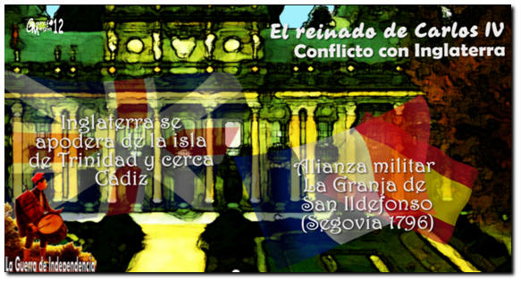 Molesta por el tratado de Basilea, Inglaterra refuerza su poder armamentístico e incrementa las hostilidades sobre las colonias españolas de América. Esa actitud propicia un acercamiento español a Francia que culmina en el Tratado de San Ildefonso, en 1796, que institucionaliza una alianza militar frente al Imperio Británico. Inglaterra, muy molesta, se apodera de la isla de Trinidad y acosa Cádiz. El poder que alcanza Napoleón en Francia a partir de 1799 incrementa la influencia francesa sobre Carlos IV. Aquél será ahora quien maneje a su antojo los hilos de la política española. La firma de varios acuerdos impone a España la obligación de declarar la guerra a Portugal si esta no rompe sus relaciones con Inglaterra y unir la flota hispana a la napoleónica siempre que sea requerida para ello. El país se ve envuelto en otro enfrentamiento bélico, ahora con la vecina nación lusa, la Guerra de las Naranjas, nombre hace referencia a la rama de este fruto que Godoy, erigido en generalísimo de todos los ejércitos, regala a María Luisa de Parma en su regreso victorioso de la contienda. Es el año 1801. La tensión entre Francia e Inglaterra crece. Napoleón impone a España la obligación de aportar seis millones de pesos cada mes para abastecer a la flota gala en los puertos de La Coruña, El Ferrol y Cádiz. Exige, además, que la escuadra española viaje junto a la francesa rumbo a la Martinica para desviar la atención de la marina inglesa y facilitar el paso del ejército francés a través del Canal de la Mancha.