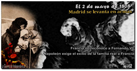 Circula de manera insistente por la villa el rumor de que Napoleón no reconoce a Fernando VII como rey de España y las tropas francesas se mueven por Madrid con autoridad y actitudes provocativas que irritan a los ciudadanos. El requerimiento del emperador para el traslado a Bayona del infante Don Francisco y de la reina de Etruria junto con sus hijos, caldea los ánimos de los madrileños que se agolpan ante el Palacio Real con objeto de impedir su salida. El llanto del niño es el detonante que enfrenta a la multitud con la escolta que acompaña al cortejo. Murat envía un batallón de granaderos que dispara sobre la muchedumbre indefensa. Se generaliza así un enfrentamiento que se extiende por las calles adyacentes. Numerosos sublevados dirigidos por los capitanes Daoiz y Velarde se hacen fuertes en el Parque de Monteleón durante horas. La superioridad francesa, que cuenta con los refuerzos del General Moncey, termina por dominar la situación. Un bando de Joaquín Murat dispone pena de muerte para todo aquel que sea hallado con armas en la mano. En la noche del dos a tres de mayo se suceden las ejecuciones de patriotas en la Puerta del Sol, en San Ginés y en el alto de Príncipe Pio. Los invasores han sufrido las bajas de sesenta oficiales y alrededor de novecientos soldados. El comienzo de la guerra: El gobierno en las zonas sublevadas