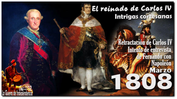 Carlos IV toma, ante la Corte y los ministros, la decisión de desposeer a Godoy de todos sus poderes y asume personalmente el mando del Ejército y de la Marina, pero el 19 de marzo el ministro es localizado escondido en su casa. La plebe, indignada, clama por su linchamiento. La única salida al conflicto es la abdicación de rey en la persona de su hijo, desde ese momento, Fernando VII. Murat, que ha llegado a Madrid el 23 de marzo, consigue de Carlos una retractación privada de la abdicación y aconseja a Fernando VII se entreviste con Napoleón quien, supuestamente, viene con esa intención a España. El encuentro tiene lugar finalmente en Bayona, donde también están Carlos IV, María Luisa de Parma y Godoy. En medio de vergonzosas escenas familiares, el emperador consigue que Fernando devuelva la corona española a su padre a cambio de posesiones y rentas, y que éste, a su vez, la ceda a Francia recibiendo, en pago, el palacio de Compiègne, el castillo de Chambord y cuatro millones de pesos anuales.