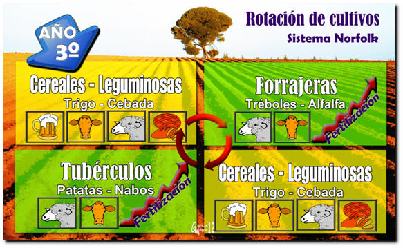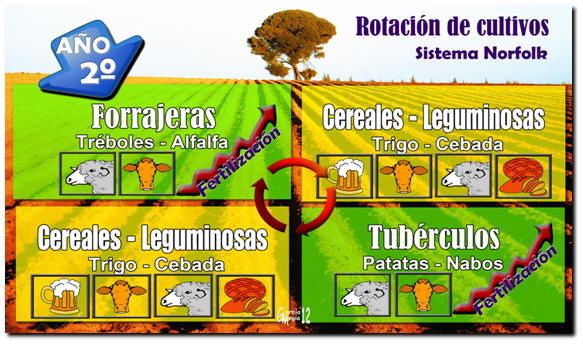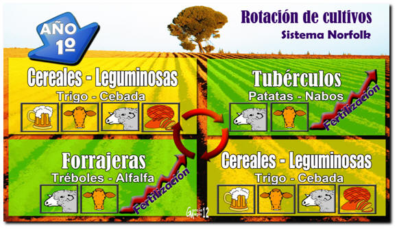 Los cambios en la agricultura merecen el calificativo de Revolución Agraria. Los más significativos son el cercado de los campos abiertos de carácter comunal, la rotación de cultivos, que permite regenerar la tierra sin pérdida de superficie cultivable, y la estabulación del ganado. El sistema Norfolk, nombre con el que se designa a la rotación cuatrienal que se implanta en tierras inglesas, consiste en plantar dos hojas de la tierra con cereales o leguminosas y otras dos con tubérculos (patatas o nabos) y forrajeras (alfalfa, trébol…) que se hacen girar anualmente. La alternancia de tubérculos y forrajeras, que enriquecen los suelos, con cereales, mejora el rendimiento de esta cosecha y proporciona alimento a los animales elevando el número de cabezas que puede mantener.