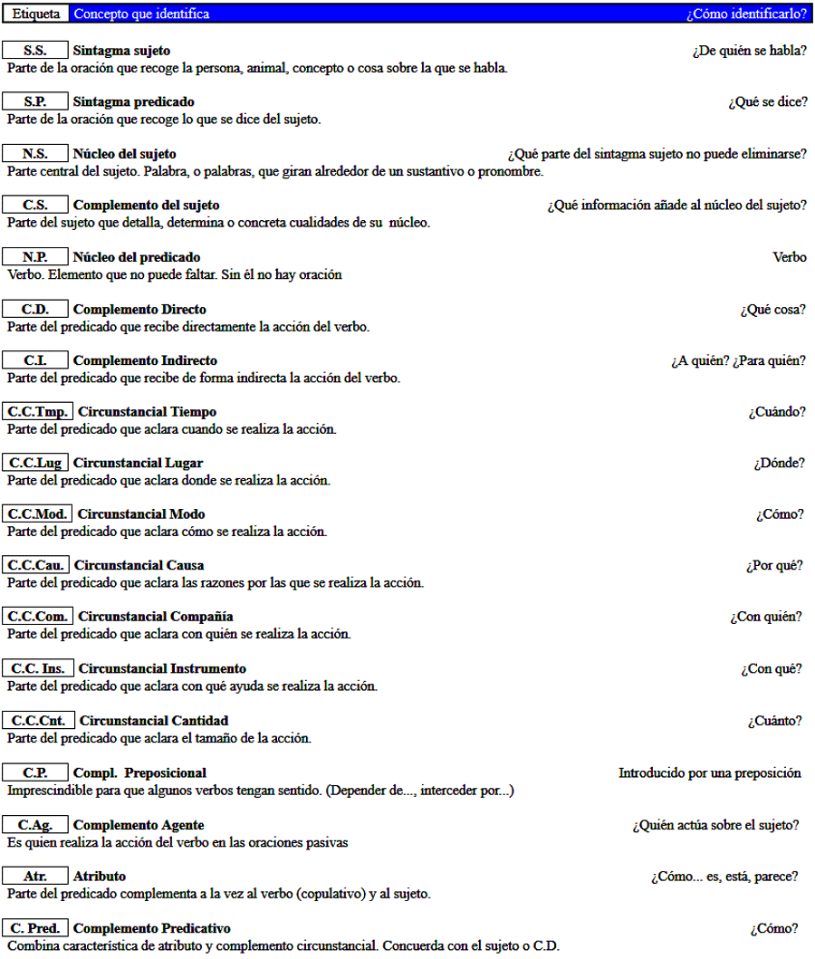 Si se observa el mensaje desde otro punto de vista encontramos un fragmento que identifica claramente a quién hace referencia. Es el SUJETO. Otra sección del discurso especifica lo que comentamos del sujeto, es el PREDICADO. Estas informaciones básicas y comunes son detalladas o matizadas con datos adicionales como que especifican cuándo, cómo dónde, a quién, qué… Se denominan COMPLEMENTOS. Describir todos estos elementos es ¡Análisis sintáctico!