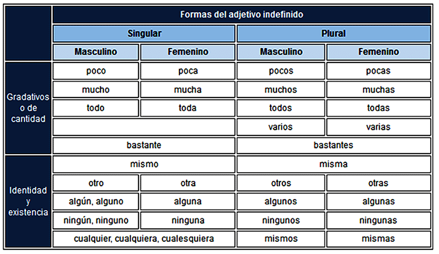 Indefinidos gradativos de cantidad: indican el grado o la cantidad con que se percibe lo designado por el nombre. Son: todo, mucho, poco, bastante. Concuerdan en género y número con el nombre al que determinan. Hay pocos alumnos, todos los sueños no se cumplen…