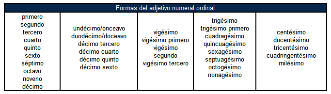 Ordinales: indican un orden dentro de una sucesión de números enteros. Llevan obligatoriamente artículo y concuerdan en género y número con el nombre al que se refieren. El segundo vehículo, los terceros premios… Se produce apócope en: uno -> un, primero -> primer, tercero -> tercer