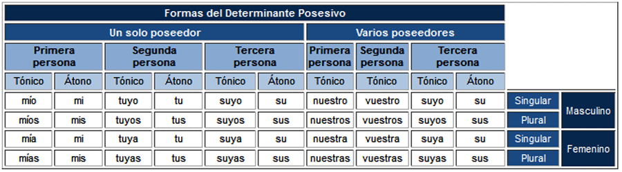 Formas átonas: Mi/mis, tu/tus, su/sus.
