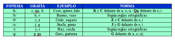 La grafía o letra es una representación escrita del fonema. La ortografía regula las normas de corrección en el uso y la representación. El fonema se representa entre /barras/; “a” es la representación del sonido /a/ y “z” la letra con que se transcribe el fonema /z/ (en fonética internacional /θ/). En castellano hay veinticuatro fonemas y veintinueve letras. El cuadro que sigue muestra las convergencias y divergencias entre esas grafías y fonemas.